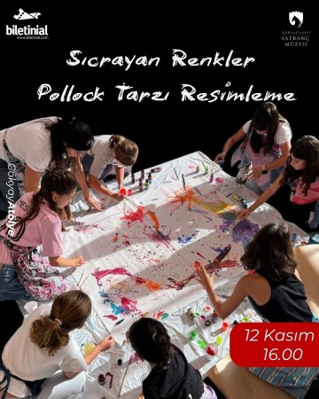 12.11.2025 Renk Sıçraması – Pollock Tarzı ResimlemeBoyalar özgürce akıyor! Yere serilen tuval üzerinde fırça, damlatma ve sıçratma teknikleriyle soyut bir sanat eseri oluşturuyoruz.